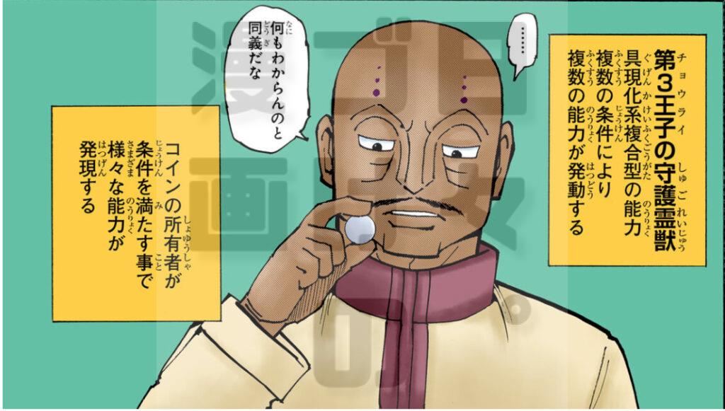 チョウライの守護霊獣の能力、すなわちコインがどのような効果をもたらすのかは、読者向けにはもう少しだけ情報が開示されています。