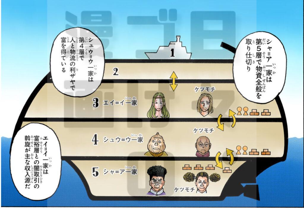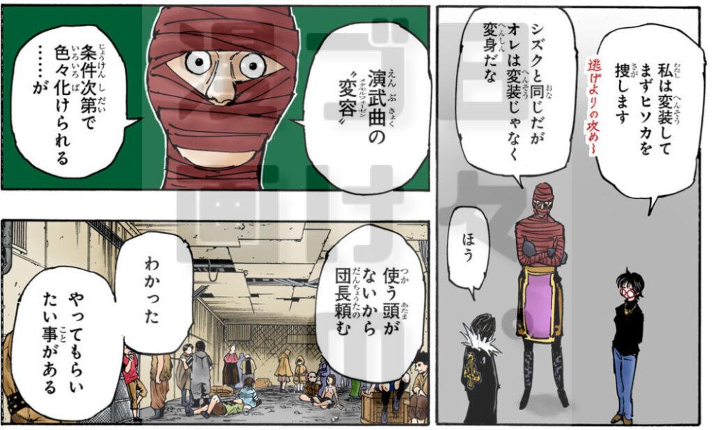 クロロらは第4~5層付近。シズクは”変装”、ボノレノフは”変身”して、クロロの指示のもと行動中。
