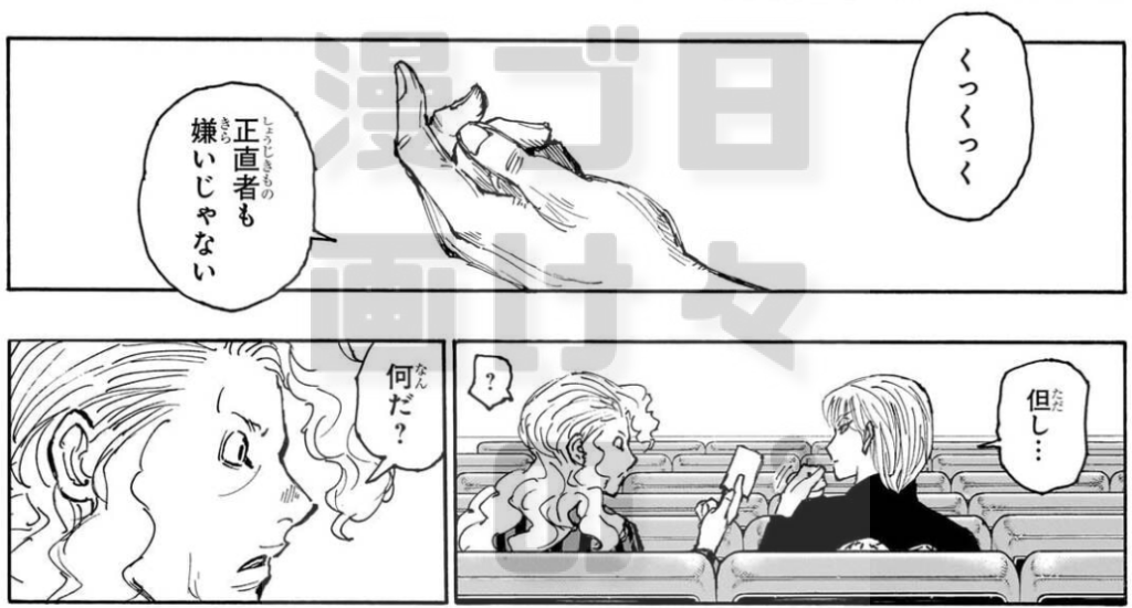 ヒソカのモノローグにて、彼の戦闘(バトル)に対するポリシーが語られます。