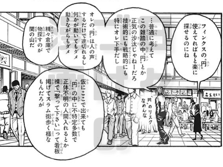 フィンクスが「この雑踏の中”円”とか正気の沙汰じゃない」と言っていましたが(詳しくは後述)、ヒンリギはそれを実行しているということになりますね。