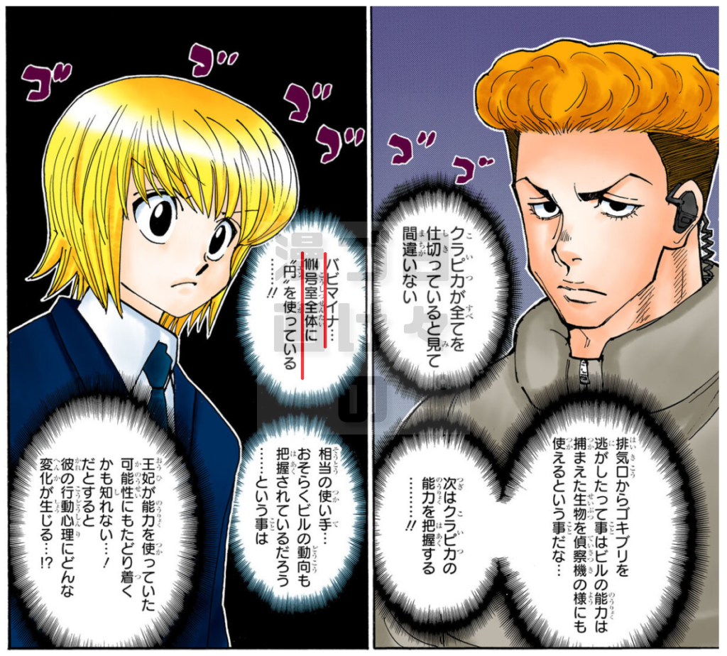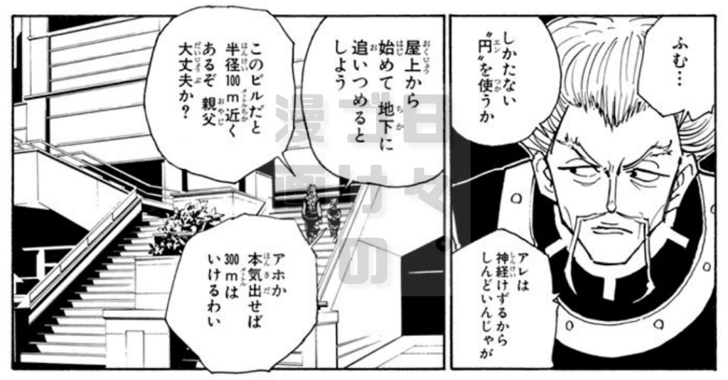 2人とも作中屈指の強キャラであり、”円”の使い手としても(人間の中では)作中最高レベルと言っていいでしょうね。