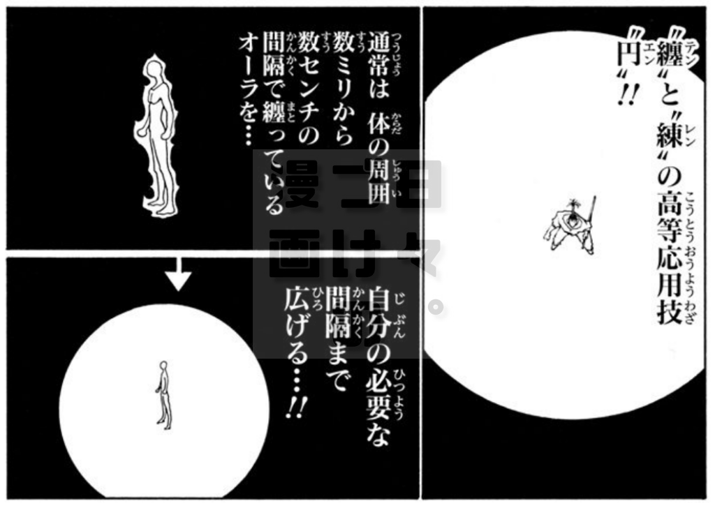 “円”は、念能力の基礎である四大行のうち”纏”と”練”の高等応用技になります。