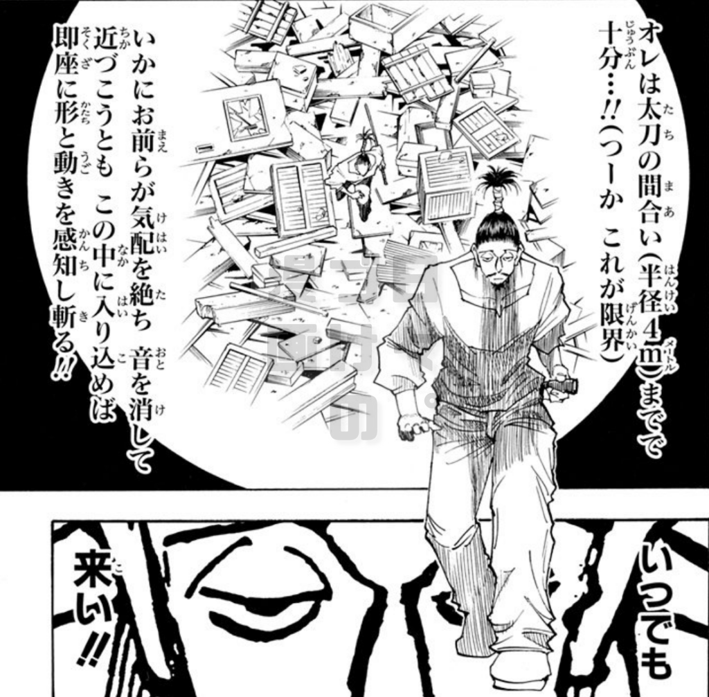 ノブナガは半径4メートルまでで「これが限界」と言っていますし、フィンクスは自ら「オレ下手だし」と言っています。