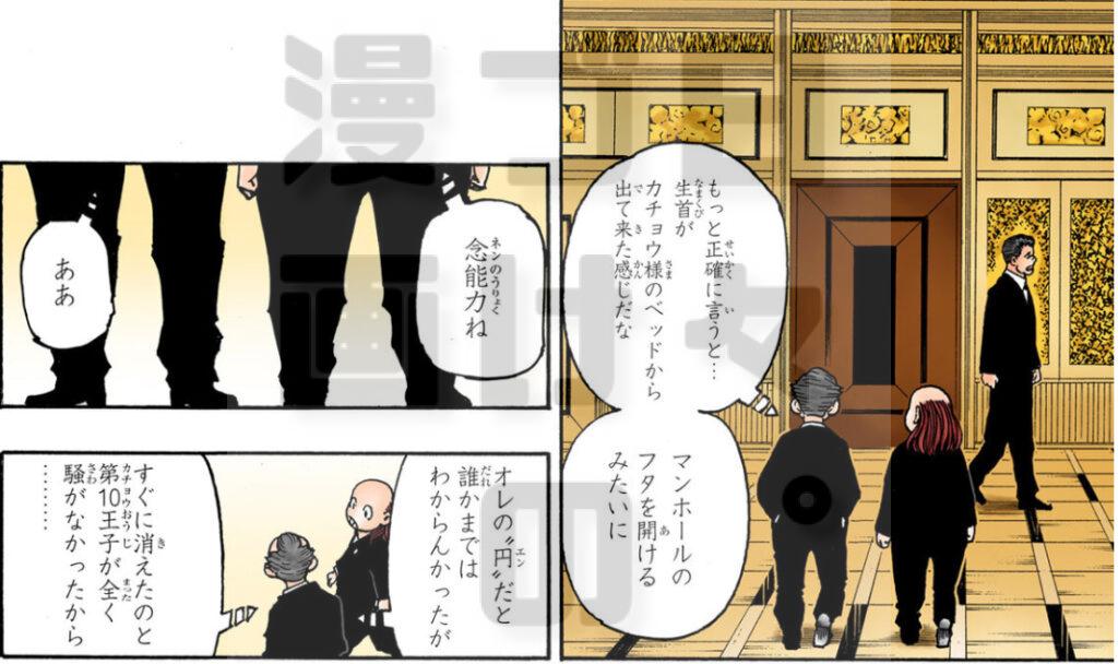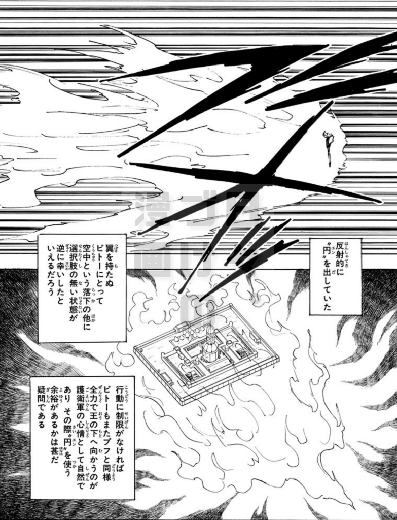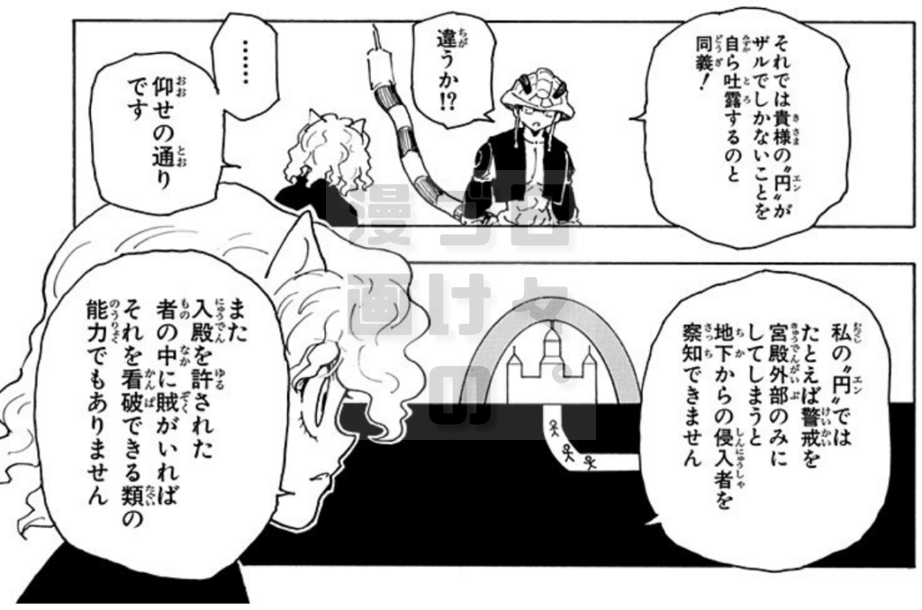 また、メルエム誕生後に宮殿に拠点をおいてからは常時”円”を維持していました(メルエムの腕の治療というイレギュラー時を除く)。