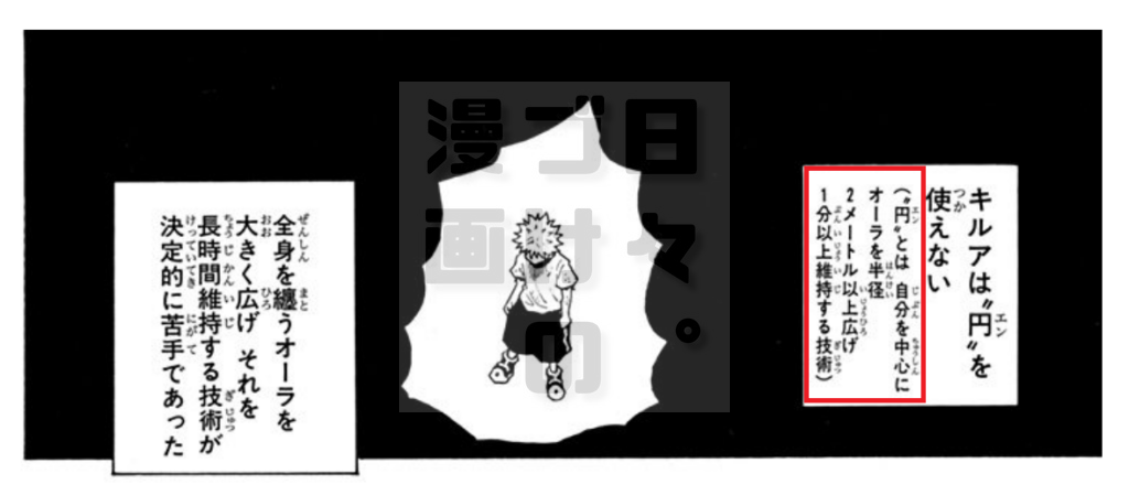 キルアもゴンと同様、キメラ=アント編時点では定義上の”円”を使えません。