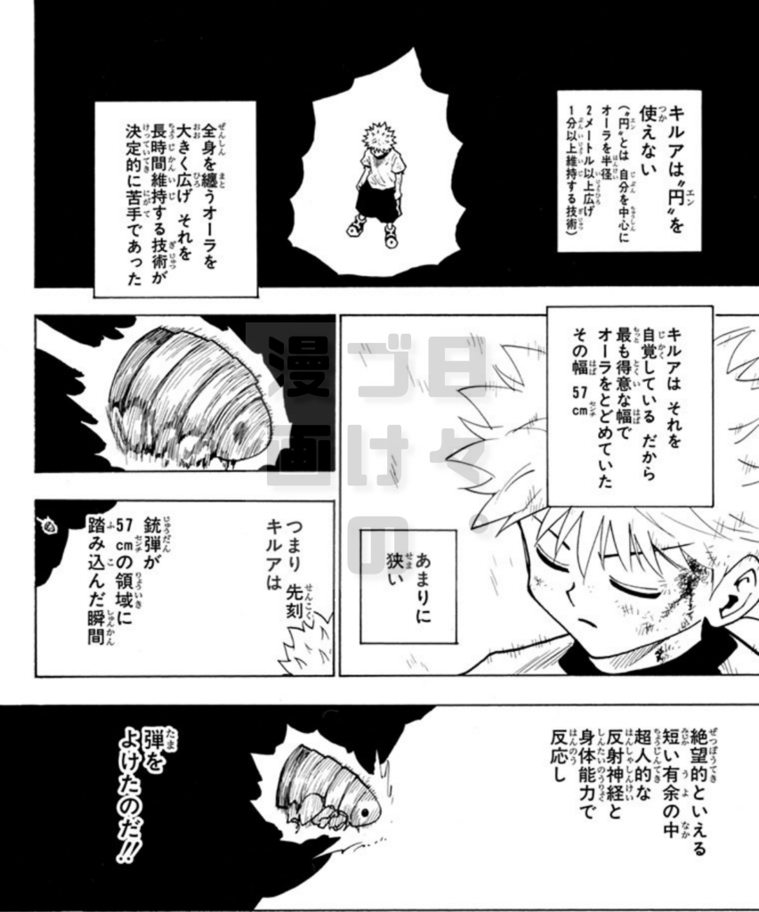 そのオーラ範囲は57cmと、”円”にははるかに及びませんが、キルアの常人離れした反射神経と身体能力で弾丸を回避しました。