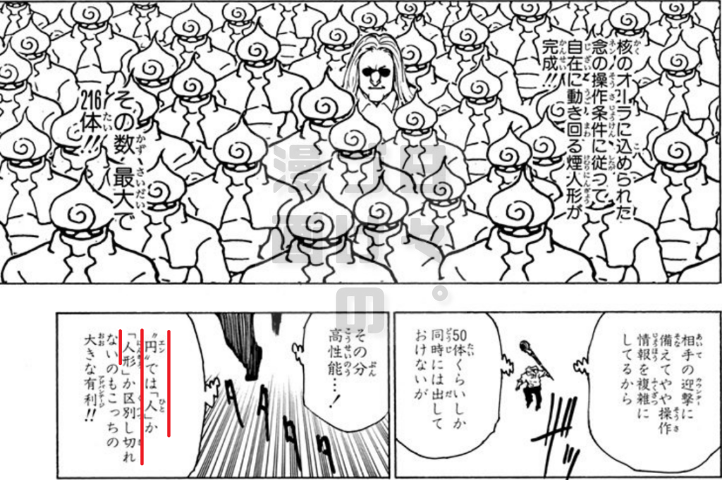 モラウの紫煙機兵隊(ディープパープル)で作られた煙人形も、”円”では人間かどうか区別できません。これを利用してモラウは護衛軍をかく乱しました。