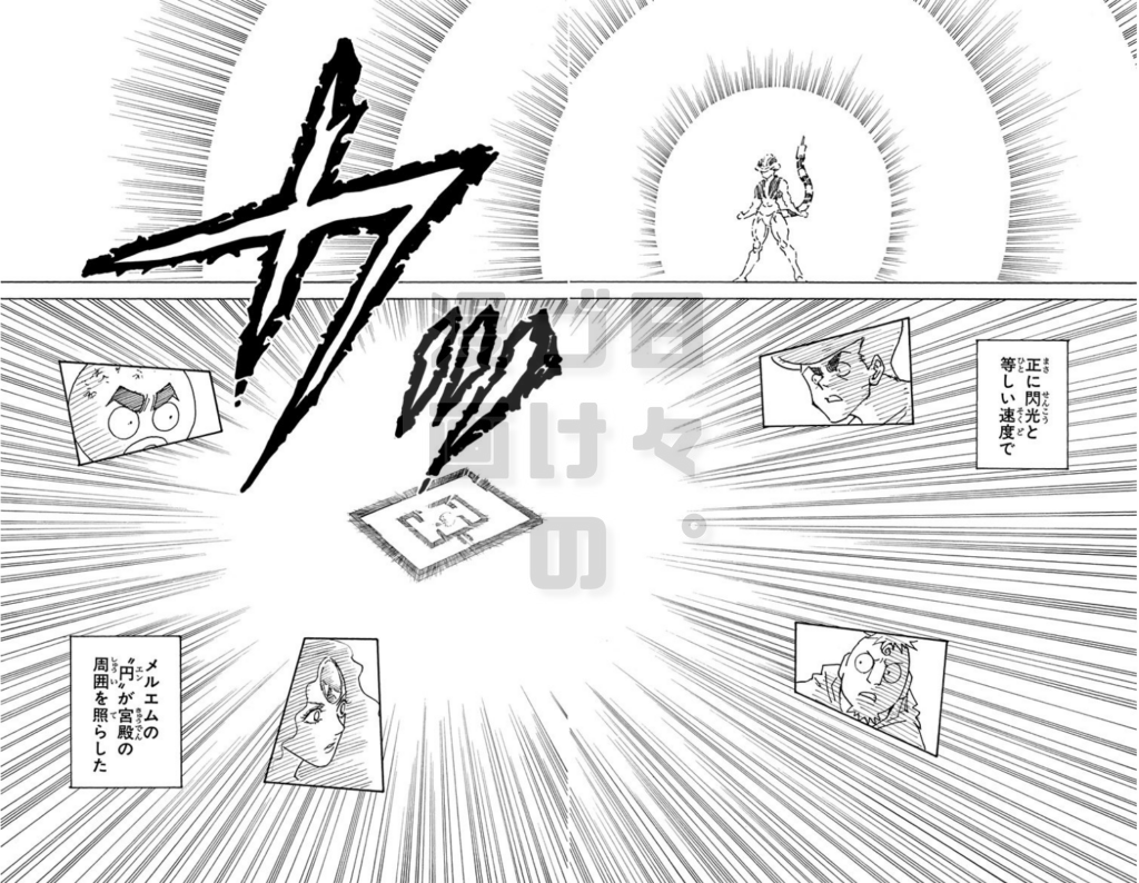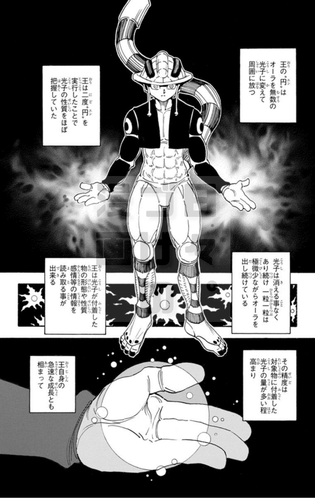 メルエムの”円”は「光子レベルの極微小なオーラを放つ」とありますが(これが他の術者にも共通することなのかは不明です)、その光子レベルのオーラを自在に操るようになりました。