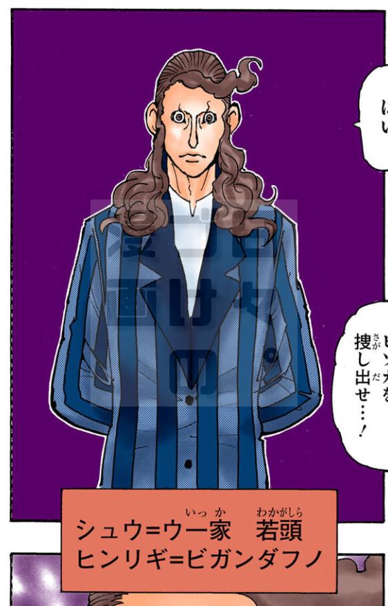シュウ=ウ一家若頭で、具現化系の発「てのひらを太陽に(バイオハザード)」により、物質を生物に変換する能力を持つ男。投げナイフも得意としています。